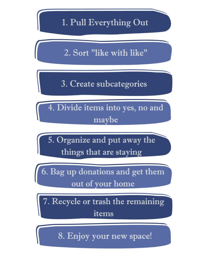 Pull Everything Out – This is such a critical step and one we really encourage everyone to do for several reasons. First, if items are left in their current space, whether that’s a closet, a pantry or a drawer, it’s too easy to pass over something you don’t want to make a decision about. Once an item is out in the open, and you have to consciously decide to put it back, it may become obvious to you that you don’t really want it or need it. Second, if you can see everything you have, you may find you have duplicates or more than one item that serves the same purpose and you likely won’t need both. And lastly, if everything is pulled out, it makes creating an organized system for the items you are keeping easier to implement.