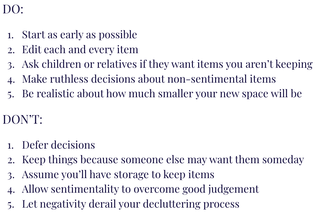 We often find that when people have to downsize, they assume that they’ll have enough room, either in their new home or in a storage unit. But the fact is, smaller homes rarely have extra space and you’ll likely be fighting for every Inch. We highly recommend decluttering your possessions rather than renting a storage unit. It will end up as a forever cost and once your things go in there, it’s probable that you’ll forget you even own them. With the possible exception of holiday decorations, storage units are just a place for deferred decisions to live.