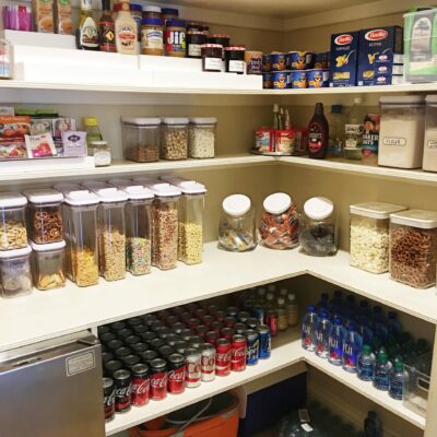 It makes sense to store all of the above in the pantry because they are used in the kitchen, but they can be organized more efficiently if they are grouped together like with like. For example, put all of the paper goods together on a high shelf because they aren’t used daily and lighter things are easier to get down from above. Place pet food and supplies on the lowest shelf to keep them separate from the family’s food.